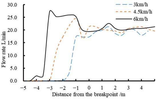 In this subsection, the flow-rate-control performance verification of the system during breakpoint continuous spraying with a target flow rate of 20 L/min at speeds of 3, 4.5, and 6 km/h is discussed. The three speeds corresponded to dosages of 328, 219, and 164 L/ha, respectively. During the testing, the system recorded vehicle speed, main pipeline flow rate, and distance to the breakpoint on the SD card during breakpoint continuous spraying. By analyzing the variation laws in distance to the breakpoint and the corresponding main pipeline flow rate, the hysteresis compensation and flow rate control performance of the system during breakpoint continuous spraying were validated.