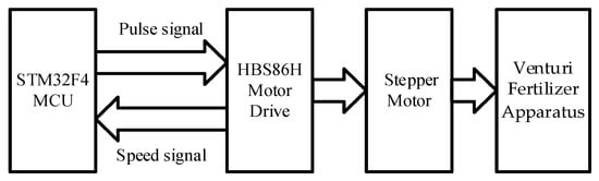 This research uses the STM32F4 MCU as the core of the stepper motor controller, and the working principle of the precise fertilizer discharge module is shown in Figure 2. The STM32F4 MCU had sufficient pin resources to meet stepper motor controller needs [22]. The stepper motor controller can send pulse signals, direction signals, and enabling signals to the driver. The driver uses a HBS86H motor driver, which could realize the subdivision drive of the stepper motor. The HBS86H motor driver uses a 1000 p/r high-precision optical encoder. Unlike traditional internal microstep drivers, the HBS86H motor driver integrates a high-performance dual-core digital signal processor. And it can perform well under high loads and high-speed conditions without any out-of-step or positioning errors. On the other hand, the HBS86H motor driver can adjust the control current in real-time according to load changes, so it can reduce heat generation and improve usage efficiency [23].