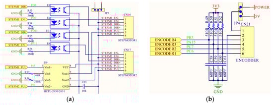 We designed the stepper motor control circuit and rotational speed feedback circuit as shown in Figure 3. And in the design of the electronic control hardware for the precise fertilizer discharge module, the pulse frequency was set at 84 Mkz, the encoder used a 5 V power supply, and the sampling frequency was 50 Hz [24]. The controller used comparison output, the stepper motor rotary speed was controlled using the timer TIM8 in the STM32 chip, and the encoder used the timer TIM3 to capture the encoder signal.