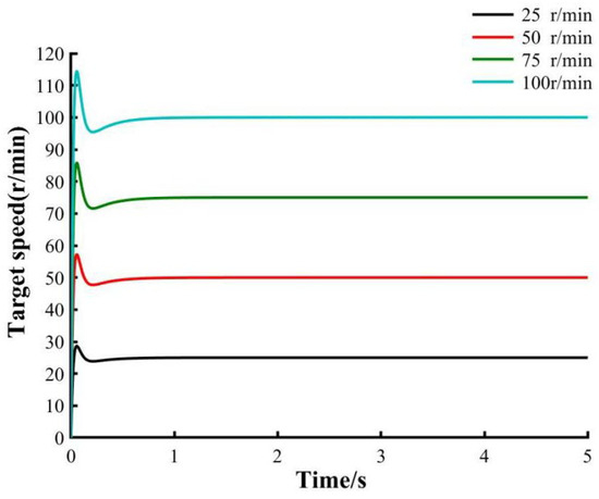 The simulation results of Kp, Ki, Kd, and N were 14.01, 55.72, 0.7781, and 667.1, respectively. Under these parameters, different input rotational speeds of 25, 50, 75, and 100 r/min were set, and the response characteristic curve was drawn as shown in Figure 6. When the rotational speed was 100 r/min, the maximum overshoot was 14.4, and the response time was 1.5 s. As shown in Figure 6, the overshoot increased with the increase in rotational speed, and the response time was roughly the same.