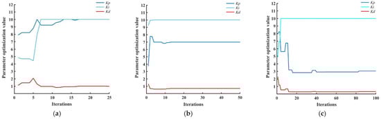 At 25 iterations (Kp = 10, Ki = 10, Kd = 0.99), 50 iterations (Kp = 6.99, Ki = 10, Kd = 0.7), and 100 iterations (Kp = 3.05, Ki = 10, Kd = 0.32), numerical iterations are shown in Figure 7. From Figure 7, with the increase in iteration number, we see that the response time was stable at 1.5 s, the overshot was reduced, and the robustness and responsiveness of the control system were gradually optimized.