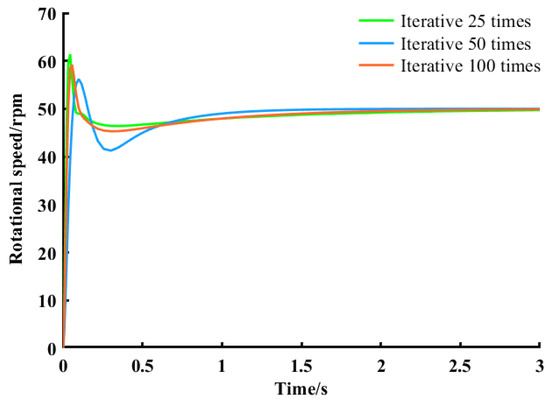 The input parameter values were obtained from different iterations of the system model. In the Simulink model, the input signal was set at 50 r/min to obtain the response characteristic curves under the three optimization parameters (Figure 8). As shown in Figure 8, the response time of the system was longer, and the overshot was greater than 10 when the iteration was 25 times. With the numerical increase in iterations, the overshoot tended to be stable, and the response time was short. After 100 iterations, the response time of the system met the needs of the system, and the final parameters of Kp, Ki, and Kd were determined to be 3.05, 10, and 0.32, respectively.