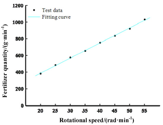The mathematical relationship between fertilizer discharge and stepper motor rotational speed was measured through the test, and the relevant experimental results are shown in Figure 9. Then, through regression analysis of the MATLAB Cftool toolbox, the mathematical model was obtained from Formula (10).