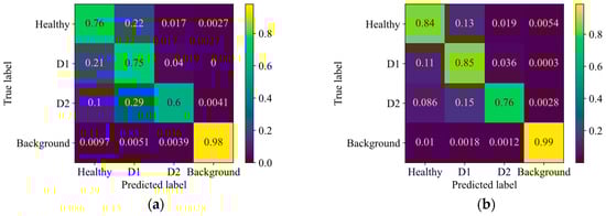 Figure 11 displays the confusion metrics comparing the prediction accuracy of each model for each class. All models exhibited a high accuracy in detecting background pixels, achieving accuracies of 0.97, 0.98, 0.99, and 0.99 for SVM, RF, 1D-CNN, and 1D-ResNet, respectively. However, SVM struggled to distinguish between healthy, early, and mature symptoms, achieving accuracies of 0.76, 0.75, and 0.6, respectively. In contrast, 1D-CNN better identified healthy, early, and mature symptoms with accuracies of 0.84, 0.85, and 0.76, respectively. RF achieved a higher accuracy in distinguishing healthy, early, and mature symptoms among the models, with accuracies of 0.87, 0.81, and 0.78, respectively. Finally, 1D-ResNet exhibited the highest performance in distinguishing healthy, early, and mature symptoms with accuracies of 0.87, 0.89, and 0.85, respectively.