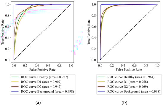 Figure 12 displays the receiver operating characteristic (ROC) curves for each model. Upon comparing the ROC curves, all models demonstrate an excellent fit for the background classes, with an AUC of 0.998. Notably, 1D-ResNet outperforms the other models in AUC for the healthy (0.976), early symptoms (0.971), and mature symptoms (0.986) classes. Both 1D-CNN and RF yield similar results in the AUC for the mature symptoms class, each achieving 0.969. RF exhibits a slightly higher AUC in the healthy and early symptoms classes compared to 1D-CNN, with 0.964 and 0.958, respectively, whereas 1D-CNN has AUC values of 0.962 and 0.947 for the healthy and early symptoms, respectively. SVM shows the smallest AUC values for healthy (0.927), early symptoms (0.907), and mature symptoms (0.942).
