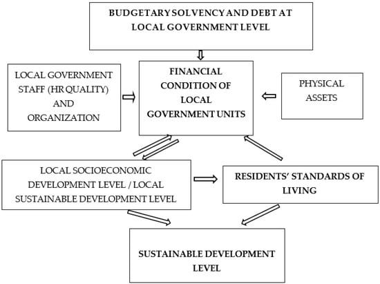 Hence, it can be assumed with no major reservations that the sustainable development level of local government units has an indirect or direct effect on residents’ standards of living. Also, there is mutual feedback between the level of sustainable development and the financial standing of LGUs (which the author believes to be mostly driven by the amount and structure of income and expenditure, budgetary solvency, financing for services and investments, and debt levels) (cf. [,,,]) (Figure 1).