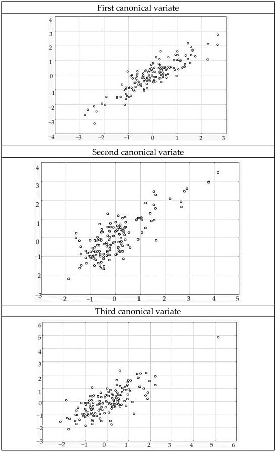 The starting point for the canonical analysis is to determine the total number of pairs of canonical variates, which will then be subject to an in-depth investigation. Note that while the first generated pair of canonical roots (which synthetically describe the relationships between the sets considered) explains most relationships between them, it does not give 100% clarification. Each successive pair of generated canonical variates explains other dimensions of relationships (of smaller importance). The Wilks’ Ʌ (Wilks’ lambda) test was performed to examine the statistical significance of canonical correlation. The test statistic for a set of s–k variables was used to check the pairs of canonical variates for significance as per the following formula []:
