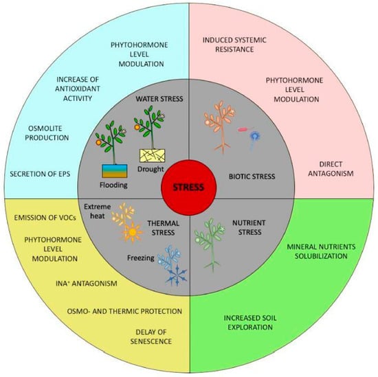 - Gupta, A.; Mishra, R.; Rai, S.; Bano, A.; Pathak, N.; Fujita, M.; Kumar, M.; Hasanuzzaman, M. Mechanistic insights of plant growth promoting bacteria mediated drought and salt stress tolerance in plants for sustainable agriculture. Int. J. Mol. Sci. 2022, 23, 3741. [Google Scholar] [CrossRef] [PubMed]