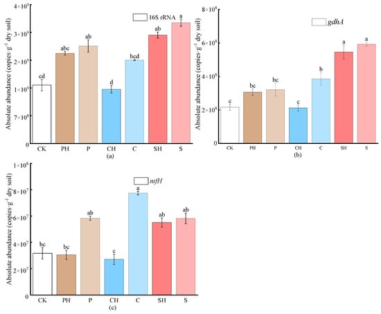 The abundance of the 16S rRNA (a), gdhA (b) and nifH (c) gene in soil after the third planting of Chinese cabbage. Note: CK, no fertilization; P, pig manure; C, chicken manure; S, sheep manure; H, fulvic acid. The data are expressed as the mean ± standard deviation. Lower-case letters above each column indicate significant differences between groups.