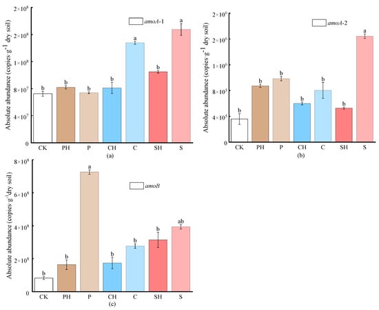 The abundance of nitrification genes amoA-1 (a), amoA-2 (b), and amoB (c) in soil after the third planting of Chinese cabbage. Note: CK, no fertilization; P, pig manure; C, chicken manure; S, sheep manure; H, fulvic acid. The data are expressed as the mean ± standard deviation. Lower-case letters above each column indicate significant differences between groups.