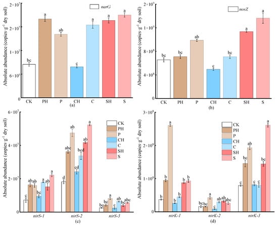The abundance of denitrification genes narG (a), nosZ (b), nirS (c) and nirK (d) in soil after the third planting of Chinese cabbage. Note: CK, no fertilization; P, pig manure; C, chicken manure; S, sheep manure; H, fulvic acid. The data are expressed as the mean ± standard deviation. Lower-case letters above each column indicate significant differences between groups.