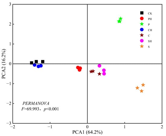 The results of the principal component analysis (PCA) of soil N-cycle functional genes impacted by different fertilization treatments are presented in Figure 4. Fertilization significantly changed the overall distribution of N-cycle functional genes (PERMANOVA: F = 69.993, p < 0.001). The treatments could be broadly classified into four groups: CK and CH treatments formed the first group, which was considerably disparate with other treatments along the first PCA axis, accounting for the 64.2% of variance; PH, C and SH treatments formed the second group; S treatments formed the third group; and P treatments stood alone, distinguished with other treatments along the second PCA axis explaining 16.2% of variance. The increase rates of the abundance of N-cycle functional genes in different treatments compared to CK were calculated (Table 7). Fertilization mainly increased the abundance of amoA-2, amoB, narG, nirK-1, nirS-1 and nirS-2, and the increase of different genes varied greatly. The P and S treatments increased the gene abundance more potently than the PH, C and SH treatments, while the influence of the CH treatment was insignificant.