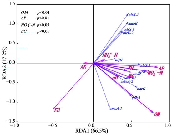 A redundancy analysis (RDA) showed that the overall effect of all environmental factors on N-cycle functional genes was significant (p = 0.002) (Figure 5), and OM (p < 0.01), AP (p < 0.01), NO3−-N (p < 0.05) and EC (p < 0.05) influenced significantly the abundance changes of N-cycle functional genes by the Monte Carlo permutation test. This was also confirmed in the stepwise regression analyses (Table 8). The environmental factors (except AK and EC) were mainly positively correlated with the N-cycle functional genes. We also found the gdhA gene was more related with OM content than other genes. The denitrification genes nirS-2, nirS-3 and nosZ were closely associated with AP, NO3−-N content. Genes nirK-1, amoB, nirS-3 and nirS-2 formed a cluster, and the increase in their abundance were obviously linked with the decrease in the value of EC.