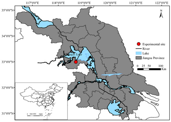 Xuyi, the investigated county (118°40′17″ E, 32°59′55″ N), is located in the Hongze Lake district, east China (Figure 1). This county is in a transitional region between the northern subtropical and warm temperate zones. It has a humid monsoon climate, with sufficient sunshine and rainfall. It is adjacent to Hongze Lake, and thus has adequate water resources. The annual average sunshine is 2222 h, the annual average temperature is 14.7 °C, the frost-free period is 215 d, and the annual average precipitation is 1005 mm. The major soil types of the local paddy field are white mound soil and clayey loess soil. The main local rice farming system is a rice–wheat rotation, whereas a rice–crayfish integrated farming system has gradually developed to become the second largest rice farming system, with an area of over 40 thousand hectares in 2019.