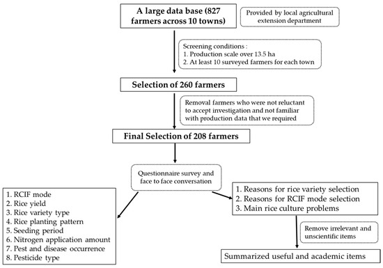The data collection process is displayed in Figure 2. We acquired a large data base of rice–crayfish integrated farming systems from the local agricultural extension department, including farmers’ names, communication information, and production scale, which covered 827 farmers across 10 towns. We randomly selected 260 farmers from the data base of 827 farmers, only in consideration of two points: (i) the farmer’s production scale is over 13.5 hectares, which occupies the majority of RCIF practitioners; (ii) and a guarantee of at least 10 surveyed farmers for each town to lower or avoid possible regional differences. Then, we communicated with agricultural technology extension personnel of counties and farmers by telephone in order to remove farmers who were reluctant to accept investigation and were not familiar with the production data that we required. After that, 208 farmers remained to be surveyed and we appointed specific times and places to carry out the survey during December of 2019 and 2020. Each farmer was surveyed individually to avoid interference from others. Some detailed and complex information was gathered by face-to-face conversations to ensure that the surveyed farmers could clearly understand the designed questions. Excel 2013 was used to undertake statistical analysis and plotting.