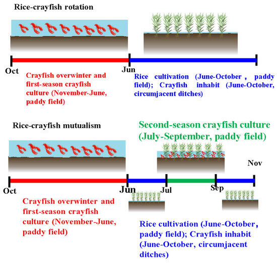 Schematic diagram of rice–crayfish rotation and rice–crayfish mutualism.