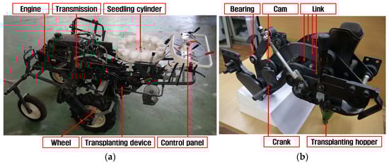 Shape of cam-type vegetable transplanter used in this study: (a) overall view; (b) transplanting device.