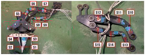 A stress measurement system was constructed to measure the stress exerted on the transplanting device, as shown in Figure 2. The stress measurement system consisted of strain gauges, a data acquisition system (TG009E, HBK, Darmstadt, Germany), and a laptop. The strain data measured using the strain gauges were transmitted to a data acquisition unit and recorded on a laptop. Two types of strain gauges were used to obtain strain data for the transplanting device links. One was a uniaxial strain gauge (KFGS-5-350-C1-11 L10M3R, KYOWA, Tokyo, Japan), which is suitable for measuring the strain in a singular direction, making it well suited for scenarios where a primary loading direction is evident, such as in axial bars or links. The second was a rosette strain gauge (KFGS-1-350-D17-11 L5M3S, KYOWA, Tokyo, Japan) that featured three strain gauges positioned at 45° intervals. The rosette strain gauge is optimal for measuring areas where the main loading direction is unknown because it encompasses three strain gauges positioned at distinct angles. Figure 3 shows the installation locations of the 13 uniaxial strain gauges (S1–S2 and S5–S15) and 2 rosette strain gauges (S3 and S4). Two uniaxial strain gauges (S1 and S2) were attached to the end of the transplanting hopper. The rosette strain gauges (S3 and S4) were attached to the curved upper part on either side of the transplanting hopper. The uniaxial strain gauges of S5, S6, and S7 were attached to the left, center, and right sides of the left upper link, respectively. Uniaxial strain gauges (S10, S11, and S12) were attached on the right upper link in the same positions as those on the left upper link. Two uniaxial strain gauges (S8 and S9) were attached to the left bottom link, and three uniaxial strain gauges (S13, S14, and S15) were attached to the bottom right link. The specifications of the strain gauges and data acquisition are listed in Table 3 and Table 4, respectively.
