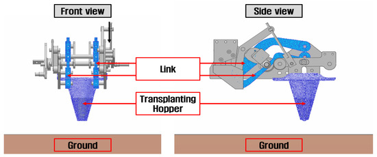 - Hwang, S.-J.; Park, J.-H.; Lee, J.-Y.; Shim, S.-B.; Nam, J.-S. Optimization of main link lengths of transplanting device of semi-automatic vegetable transplanter. Agronomy 2020, 10, 1938. [Google Scholar] [CrossRef]