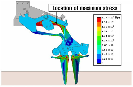 Figure 7 shows the stress simulation results for the cam-type vegetable transplanter. Figure 7 highlights the position with the maximum stress among all cam-type structures, as indicated by the simulation results. A maximum stress with a magnitude of 201.21 MPa was observed at the location of the maximum stress when the hopper entered the ground and it was in the lowest position. This specific location was positioned below the location where strain gauge S6 was attached. This component functioned as the linkage between the frame and the hopper and showed a curved configuration. Because of the rotational force exerted by the engine and the pressure originating from the interaction between the hopper and the ground, this particular area was subjected to a significantly higher force than the other elements.