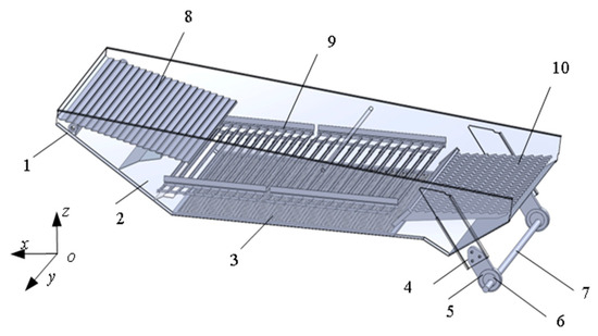 Structure diagram of the cleaning sieve: 1—front bearing, 2—cleaning sieve frame, 3—mesh sieve, 4—bearing seat, 5—bearing, 6—eccentric, 7—drive shaft, 8—shaking plate, 9—top sieve, 10—rear sieve.