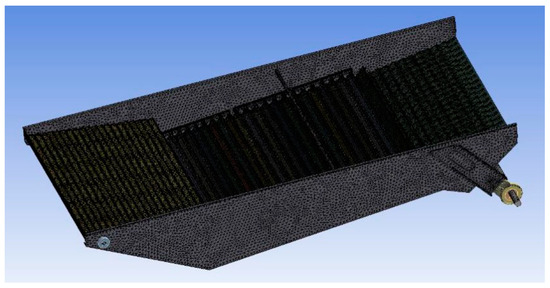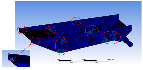 SolidWorks2020 software was utilized to establish an accurate and comprehensive 1:1 three-dimensional model of the cleaning sieve based on the physical object. Subsequently, the established model was imported into ANSYS2021 Workbench for further analysis. Considering the occurrence of nonlinear deformation or local stress concentration, and the requirement for contact on both sides of most components in the screen box model, solid elements are used for mesh division. In order to improve computational accuracy and accelerate convergence, hexahedral elements are primarily used for mesh division, supplemented by tetrahedral elements. Due to the thin frame of the sieve, tetrahedral units are predominantly utilized in this part. By referencing Table 1, the mesh size of the cleaning sieve model was precisely set to 8 mm. To enhance the analytical capabilities and optimize the mesh quality, corner encryption processing (with a mesh size of 1–2 mm) was applied to both the top sieve and the rear sieve, thus effectively eliminating undesired small features and yielding a superior mesh structure. The resulting mesh consisted of a total of 704,846 units and 1,577,310 nodes, with a unit mass of 0.62. The overall mesh quality was excellent, and the outcomes are showcased in Figure 2.