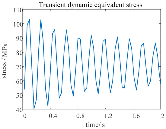 From Figure 4, it can be seen that the equivalent stress value of the cleaning sieve changed periodically in the first 2 s of the simulation. It reached the maximum peak of 102.82 MPa at about 0.07 s, and the peak then gradually decreased with time. After 0.8 s, the peak tended to be less than 91.8 MPa. The simulation results show that the maximum stress value of the main bearing parts of the cleaning sieve was lower than the tensile strength of the material used in the cleaning sieve, namely 370 MPa, and was within the safe range.