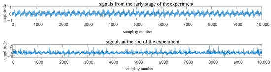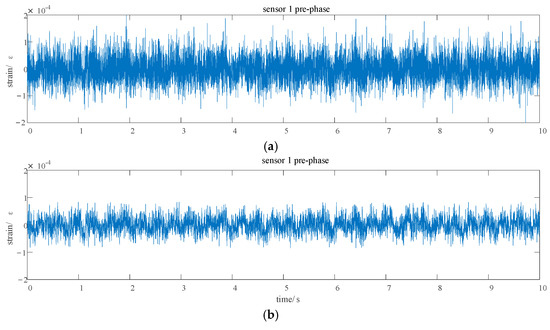 Due to the large time span of the bench test, the signals collected by the six strain sensors before and after the fault were selected for comparative analysis. After smoothing the strain signal, the mean value of each signal was calculated, and was then subtracted to adjust the initial value of the strain signal to 0. However, there remained some jump points in the smooth-processed signal that would have affected the subsequent analysis. Thus, the “filloutliers” function in MATLAB2018 was used to remove the jump points, and the early signal of sensor No. 1 is provided as an example to demonstrate the comparison before and after signal processing, as shown in Figure 14.