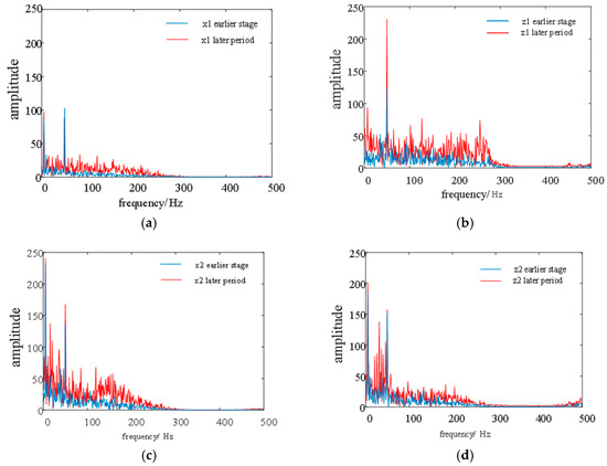 Spectral analysis is the examination of the amplitude and phase spectra obtained after the Fourier transformation of the signal. Figure 12 presents the spectrum diagrams of the two acceleration sensors in the early and late stages of the durability test of the cleaning sieve.