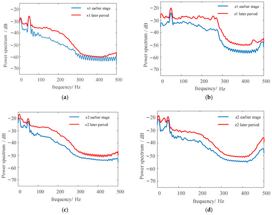 Acceleration sensor power spectrum: (a) x-axis power spectrum of sensor No. 1; (b) z-axis power spectrum of sensor No. 1; (c) x-axis power spectrum of sensor No. 2; (d) z-axis power spectrum of sensor No. 2.