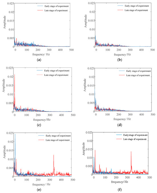It can be seen from the figure that sensors Nos. 1, 2, and 4 experienced significant changes. Sensor No. 3 changed greatly in the later period, and its amplitude increased significantly near 10 Hz. The signals of strain gauge sensors Nos. 5 and 6 located on the rear sieve support plate also underwent large changes; they detected abnormal signals with frequencies exceeding 300 Hz and large peaks at 20 and 350 Hz. In summary, sensors Nos. 3, 5, and 6 were found to have good sensitivity to the abnormal state of the cleaning sieve.