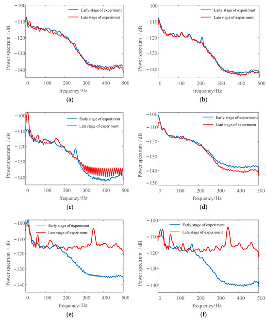 The comparison of the signals reveals that, on the whole, the power spectrum in the late stage of the test was generally larger than that in the early stage. Except for that of sensor No. 1 in the z-axis direction, the power spectrum throughout the whole test exhibited a trend of attenuation in the 0−400 Hz frequency band, and gradually increased in the 400–500 Hz band. In the 100−300 Hz band, the curve of the power spectrum in the late stage was steeper than that in the early stage. The power spectrum presented high peak values at the frequencies of 5 and 50 Hz. The power spectrum in the z-axis direction of sensor No. 1 changed little in the 0−275 Hz frequency band, showing a relatively gentle trend, and a large peak value only occurred at 50 Hz. According to the installation position of sensor No. 1 and the abnormal state record analysis of the cleaning sieve, this phenomenon is related to the gap at the shaking plate, which is consistent with the previous FFT spectral analysis results.