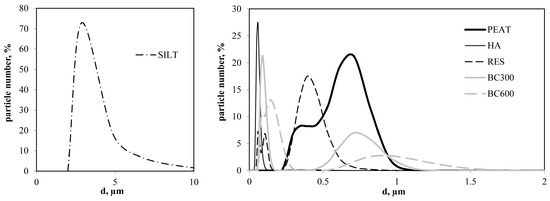 - Organic amendments were ground intensively to uniformize their particle sizes and remove impurities, which allowed the joining of the aggregate properties with the measured surface and physicochemical parameters. Particle size distribution, PSD, of the organic substrates was determined at 25 °C for suspensions of 100 mg·dm−3 materials in 1 L of 0.01 mol·L−1 sodium hexametaphosphate/0.015 mol·L−1 sodium bicarbonate solution using a ZetaSizer Nano ZS instrument (Malvern Ltd., Leamington, UK) device in six replicates. The distribution of the silt was not measured with the ZetaSizer due to large particles sedimented in the electric field. Therefore, this characteristic was determined using a laser diffraction method using Malvern Mastersizer 2000, as described by Ryzak and Bieganowski [45]. The PSD functions were expressed as the number of particles of a given radius in the total number of particles. The average particle diameter, d [m], was then calculated from PSD functions.