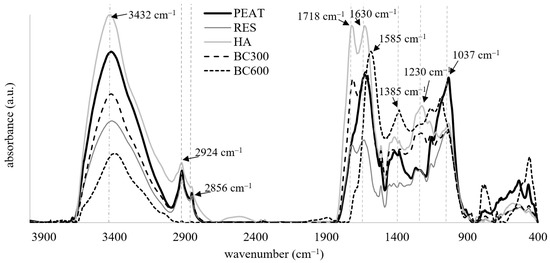 FTIR spectra of the studied organic materials are shown in Figure 2. The FTIR characteristics differ in the location and intensity of the main absorption bands. The HA and peat show the highest signal at ~3432 cm−1 assigned to the O-H stretching of carboxylic acids, phenols, alcohols, and water [55]. Significant reduction of this band for RES suggests the loss of organic components due to alkaline extraction while indicating degradation of oxygen-containing structures under pyrolysis conditions for BC600. Higher pyrolysis temperature used for the production of BC600 also resulted in the disappearance of bands at ~2924, 2856, 1718, and 1230 cm−1, which can be attributed to asymmetric and symmetric stretching vibrations of aliphatic C-H and C=O in carboxyls, esters, lactones, aldehydes, and ketones [56]. The highest intensities at 1718 and 1230 cm−1 were revealed for HA, indicating the largest population of carboxylic groups. Interestingly, clear signals of the above bands are also observed for BC300, suggesting relatively low degradation of COOH structures under the peat processing at low temperatures. High absorbance of the band at 1585 and 1385 cm−1 for BC600 shows an increasing share of aromatic structures, which are more temperature resistant [43]. The band at ~1037 cm−1, mostly attributed to cellulose, hemicellulose, and lignin [57], was the strongest for peat, slightly lower for RES, and considerably reduced for BC300 and BC600.