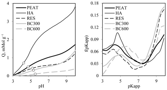 Average variable charge vs. pH curves (left) and distribution functions of apparent surface dissociation constants (right) for the original peat (PEAT), humic acid extracted from the peat (HA), residue after HA extraction from the peat (RES), and biochars obtained from the peat after 300 °C and 600 °C heating (BC300 and BC600, respectively). Points marked in the titration curves represent surface charge developed at mid values of the silt–organic mixtures. The error bars are omitted not to shadow the details.