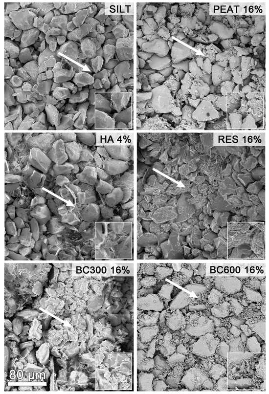 Representative SEM images of the surfaces of broken aggregates containing maximum doses of organic substances and that of the pure silt are presented in Figure 4. Different positions of the organic substances relative to the silt grains may be observed. PEAT particles occur as large agglomerates separately or close to silt grains. Agglomerated humic acid appears to be located mainly between the silt grains, connecting them to each other. Larger agglomerates of RES and BC300 can be distinguished; however, smaller ones appear to coat silt grain surfaces. Non-agglomerated individual particles of BC600 are located mainly on silt grain surfaces. A similar effect was also observed by Kelly et al. [60], who noticed that biochar remained unassociated with soil particles.