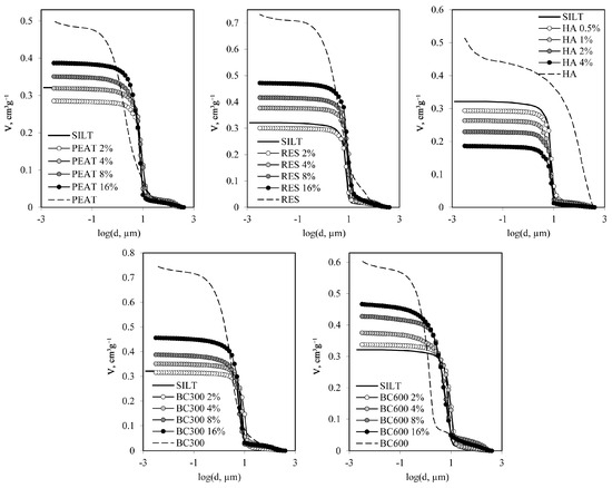 Particle size distributions of the studied materials: silt extracted from a loessial soil being a skeletal material for aggregates preparation (SILT) and organic additives: commercial acidic peat (PEAT), humic acid extracted from the peat (HA), residue after HA extraction from the peat (RES), and biochars obtained from the peat after 300 °C and 600 °C heating (BC300 and BC600, respectively) are shown in Figure 1.