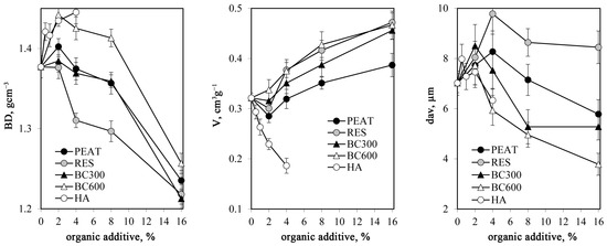 Changes in bulk densities, total pore volume, and average pore diameter in the whole MIP experimental window for silt–organic aggregates are shown in Figure 6. For aggregates enriched with HA, the bulk density increases with the HA content. The effect may be related to the location of small HA particles within larger spaces between the particles within the silt skeleton. Our findings are in line with Liu et al. [52], who found that finer organic particles can fill the pores between the coarse mineral fraction, resulting in more effective packing and higher bulk density. A similar phenomenon may explain why the bulk density of the silt–organic aggregates exceeds that of the pure silt for the small loads of the other organic substrates. An increase in BD was also observed in soils of smaller organic matter levels by Munkholm [61] and in biochar-treated field soil by Ajayi and Horn [62] or Mukherjee and Lal [63]. For aggregates containing PEAT, RES, and biochars, the bulk density goes through an initial rise before it decreases with an increase in organic substrate loads. The particle density of all organic substrates is significantly lower than that of the silt; therefore, the observed reduction in the bulk density of silt–organic aggregates at higher loads of organic substances may be a direct consequence of organic substance addition. It is also possible that after filling the silt skeletal pores, the excess of organic particles sits between the silt grains, pushing them apart and loosening the pore structure. Soil organic matter acts as a crucial bonding material in soil structure formation by establishing complexes with primary mineral particles and secondary structural units. In this way, interaggregate pores are formed, resulting in a general reduction in bulk density. Reduction in soil bulk density by organic materials has been reported by other authors, confirming the dominance of this effect at a wide range of organic material types and concentrations [52,64,65,66,67,68,69]. Furthermore, a decrease in soil bulk density is frequently observed due to biochar amendment [25,70,71]