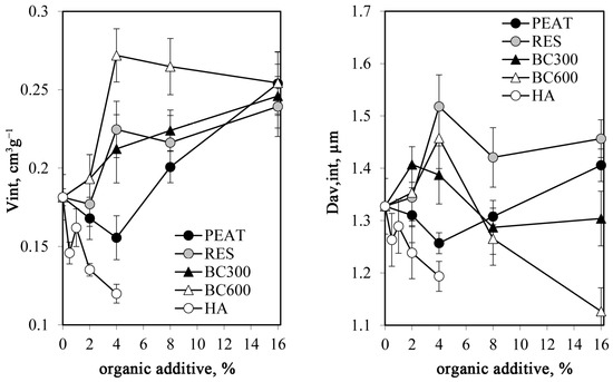 Dependence of intrinsic pore volume (left) and average intrinsic pore diameter (right) of the studied silt aggregates on a percentage of the added organic material: peat (PEAT), humic acid extracted from the peat (HA), the residue after HA extraction from the peat (RES), and biochars obtained from the peat after 300 °C and 600 °C heating (BC300 and BC600, respectively). The error bars are standard deviations.