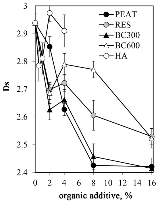 The behaviour of pore surface fractal dimensions of the studied silt–organic aggregates is shown in Figure 8. The most complicated, rough surface belongs to pores of HA-containing aggregates, for which the fractal dimension varies between 2.78 and 2.97. For low HA amendments, the fractal dimension initially decreases and then increases at higher HA loads. For the other organic substrates, the Ds value appears to decrease with the increase of the substrate dose. Similar findings were found by Sokolowska et al. [77], who noticed a substantial decrease in the peat–muck soil fractal dimension with the organic carbon content but increased with the amount of humic acids characterized by complex chemical composition and irregular structures. A decrease in fractal dimension and smoothening of pore surfaces can be due to the filling of the finest pores or the blockage of their entrances by small-sized organic particles [78].