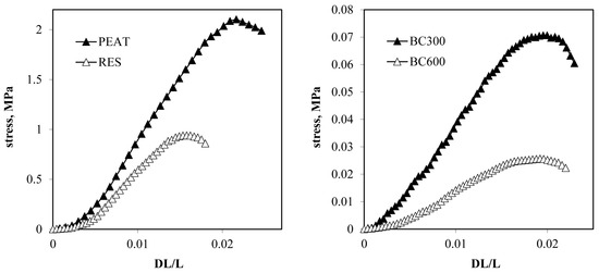 Exemplary stress–strain curves for the original peat (PEAT), the residue after HA extraction from the peat (RES), and biochars obtained from the peat after 300 °C and 600 °C heating (BC300 and BC600, respectively). The curves selected are the closest to the average ones. Note different units on the stress axis in both plots. The experimental deviation ranges (error bars) are omitted not to shadow the details.