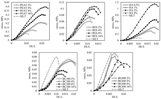 Exemplary stress strain curves for the soil silt aggregates amended with various proportions of original peat (PEAT), humic acid extracted from the peat (HA), and the residue after HA extraction from the peat (RES), and for biochars obtained from the peat after 300 °C and 600 °C heating (BC300 and BC600, respectively). Selected curves are the closest to the average. Note different scales on both axes for various aggregate groups. The experimental deviation ranges (error bars) are omitted not to shadow the details.