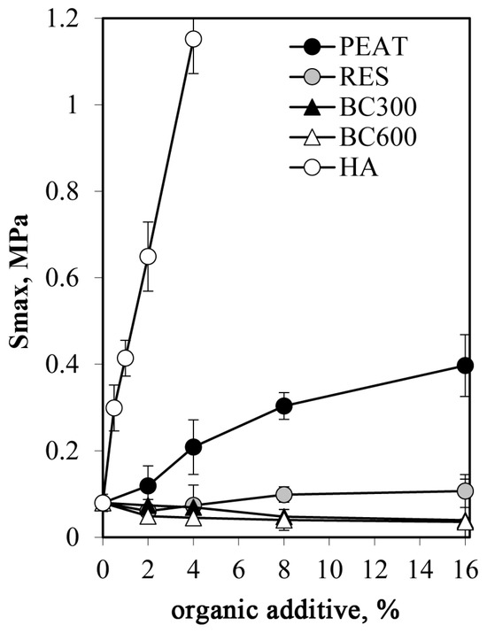 Dependence of maximum stress of the studied silt aggregates on the percentage of the added organic material: peat (PEAT), humic acid extracted from the peat (HA), the residue after HA extraction from the peat (RES), and biochars obtained from the peat after 300 °C and 600 °C heating (BC300 and BC600, respectively). The error bars are standard deviations.
