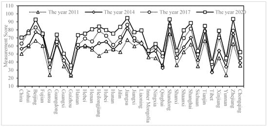 Following the measurement index system and measurement method established earlier, the results of evaluating the level of rural industrial integration development in China’s 31 provinces are shown in Figure 1 (for a direct comparison, only the measurement results for the years 2011, 2015, and 2020 are displayed). Observing the overall trend, except for a few provinces (such as Inner Mongolia, Qinghai, etc.) that remained unchanged or slightly declined, the industrial integration development levels of China and its provinces consistently showed an upward trend. From a regional perspective, provinces located in the eastern region (such as Beijing, Zhejiang, Shandong, and Jiangsu) have markedly higher levels of industrial integration development than those in the western region (such as Guizhou, Yunnan, Chongqing, and Tibet). While the central region’s industrial integration level is slightly higher than that of the western region, it is generally lower than the Chinese average. This indicates a significant unevenness in the industrial integration development levels across China’s provinces. The eastern region, due to its locational and economic development advantages, has taken a leading position in promoting rural industrial integration [31]. In contrast, the potential of the central and western regions is yet to be fully exploited. The resource utilization efficiency is not high. However, the measurement results suggested that there is substantial potential for growth in industrial integration development.