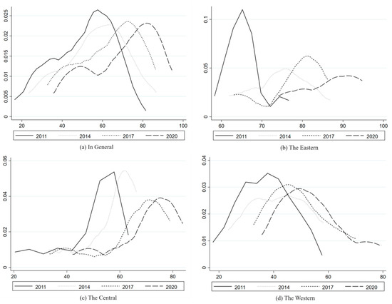 Based on the Gaussian kernel density function, the dynamic distribution of rural industrial integration levels in China and its various regions was analyzed, with results shown in Figure 2. In general, the eastern, central, and western regions have all seen significant improvements in their levels of rural industrial integration. Specifically, in the eastern region, the peak height of the distribution curve in 2011 was relatively high and narrow. Between 2014 and 2020, there was a noticeable shift toward a lower peak and a broader curve. In the central region from 2011 to 2020, the peak height of the distribution curve initially decreased, before slightly rising. In contrast, in the western region, the width of the peak remained relatively stable from 2011 to 2020, but the peak height slightly decreased.