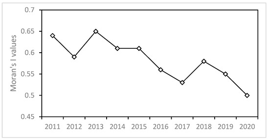 To further delve into whether the development level of rural industrial integration in each Chinese province has any correlation with its neighboring provinces, this study used a spatial weight matrix and adopted the Moran’s I index to perform a global spatial auto-correlation analysis on the measurement results of the 31 provinces. The outcomes are illustrated in Figure 3.