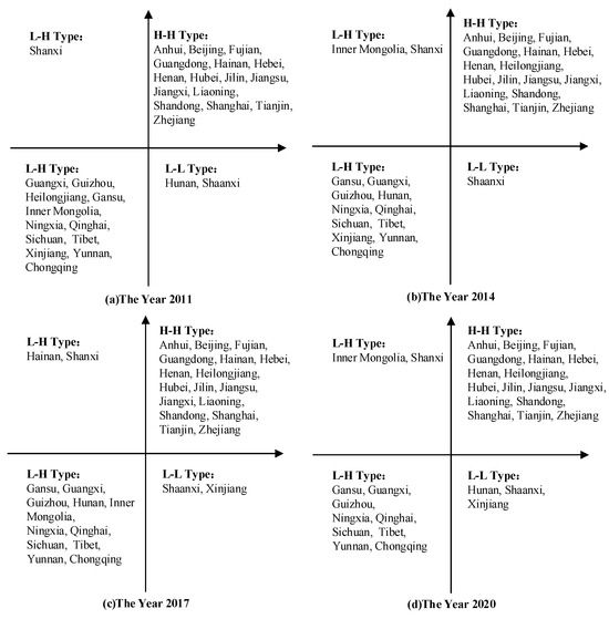Furthermore, understanding the spatial auto-correlation can provide insights into potential spillover effects, where growth in one province could positively or negatively influence development in adjacent provinces. This is crucial for designing comprehensive and effective regional development policies. The local Moran’s scatterplot was further organized, as shown in Figure 4.