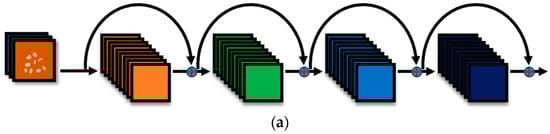 DenseNet, which begins with feature maps and uses a denser connection approach, is mostly based on the concept of the residual structure of ResNet. To ensure the maximal information flow between each layer (Figure 3b), forward propagation concatenates the feature maps of each layer with those of the other levels in the channel dimension.