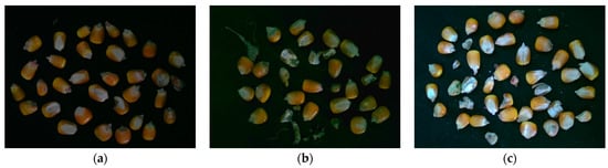 A Grain King TB70 grain combine harvester modified with a 4YB-4A corn header was used to gather the corn kernels for this study in Laowangji Town, Zhecheng County, Shangqiu City, Henan Province (34°07′3.11″ N, 115°30′23.84″ E, at an altitude of approximately 44 m above mean sea level), China. The variety is Xianyu 335. A black cloth was covered with the requisite grains after the corn harvester had unloaded the grain. A Shunhuali 500W industrial camera (8 mm focal length lens, Shenzhen Shunhuali Electronics Co., LTD., Shenzhen, China.) was used to randomly record 600 photographs of the grains at various exposure levels and with various contaminants (Figure 7). Table 1 displays the specific image distribution.