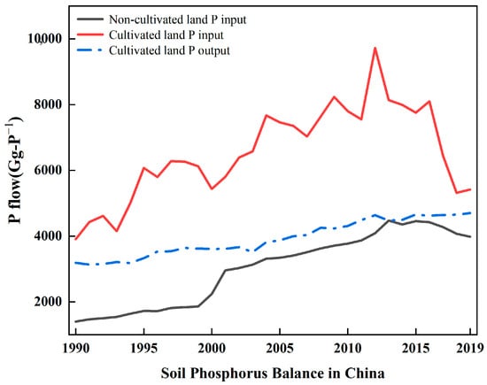 Based on the approach of Haygarth et al. [45] in studying P balance, this study delineates the P flows entering arable and non-arable land (Figure 3) and the P outflows from arable land, illustrating the state of China’s soil P balance since 1990. The peak of soil P accumulation in agricultural planting occurred in 2012, reaching 5088.1 Gg, and then showed a declining trend, especially after the adjustment of China’s P resource management policy in 2016, leading to a significant decrease. By 2019, it dropped to 719 Gg. The reason is that the significant reduction in P fertilizer inputs did not affect crop yields, indicating that, since 2016, P utilization in China’s agricultural planting has become more effective, thus reasonably improving the soil P balance. If the regional soil P balance has been achieved, then in the fertilization of the following year, there is no need to apply more than the P outflow of the previous year [39]. The P inputs into non-arable land mainly come from tailings in the P mining stage, solid waste in the chemical production stage, crop straw, animal manure, and human domestic waste.